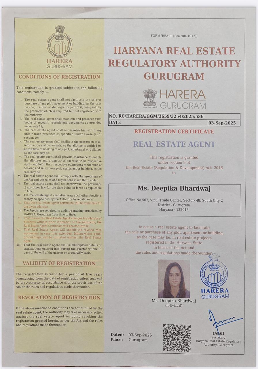 Real Estate Agent Name and Rera : Ms. Deepika Bhardwaj, RC/HARERA/GGM/3659/3254/2025/536